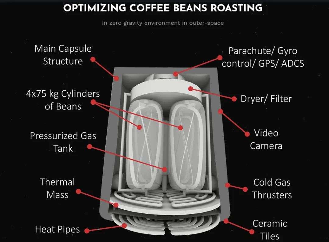 Space Roasters表示,它已经获得了“太空烘焙胶囊”的专利,其中来自重新进入的热量将分布在四个圆柱体周围,每个圆柱体装有75公斤咖啡豆。咖啡豆会在微重力环境中被均匀地加热和烘烤,整个过程将只持续20分钟。