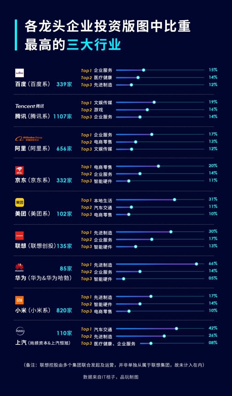 总体而言,“联华小上”由于集团战略和业务原因,更倾向于投资制造业,均把先进制造业作为主要投资方向。而“BATJM”5家企业当中除了百度,其余都没有把先进制造业作为主要投资方向。