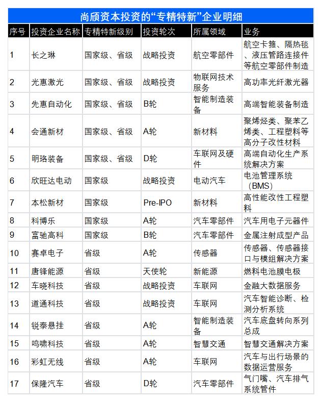 尚颀资本投中的17家“专精特新”,绝大部分集中于汽车产业链,尤其是智能汽车、车联网领域。