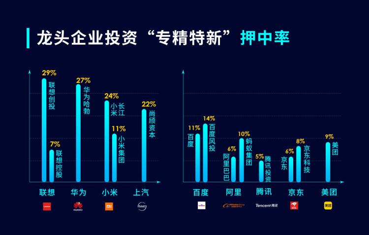 事实上,龙头企业对“专精特新”中小企业的引领带动作用已经得到验证。李毅中文章数据显示,近年来在产业投资领域最活跃的25家龙头企业,共计投出了近400家“专精特新”。许多被投资的初创企业正是由于得到龙头企业在资金、订单、技术等方面的大力扶持,才快速成长为“专精特新”。在上榜的25家机构中, 联想、华为、小米、上汽,4家龙头旗下的产业投资机构居“专精特新”投中率前4名,投中率均超过了20%。也就是说,它们每入股5家企业,就诞生了至少1家“专精特新”。