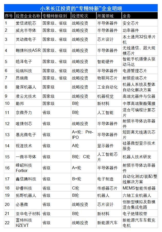 小米长江投资的22家“专精特新”,行业分布也高度集中在半导体产业链,此外还有少量企业分布在智能硬件、新能源领域。