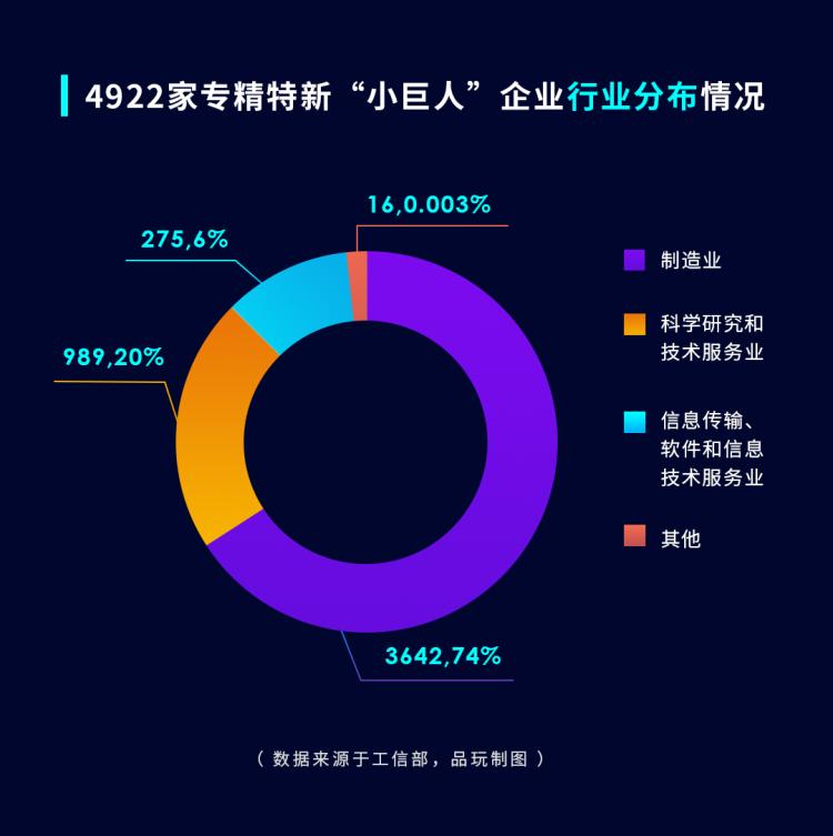 从大背景上来看,国家发展专精特新中小企业是为强化科技创新和产业链供应链韧性,补链强链、解决“卡脖子”难题,因而,我国“专精特新”发展方向重点围绕制造业十大重点领域,并着力突破工业“四基”发展瓶颈。由此,能够获得“专精特新”认证的中小企业大多分布于制造业。根据工信部2021年公布的数据, 近5千家“专精特新”小巨人企业当中,74%集中于制造业,20%分布于科学研究和技术服务业,6%分布于信息传输、软件和信息技术服务业。