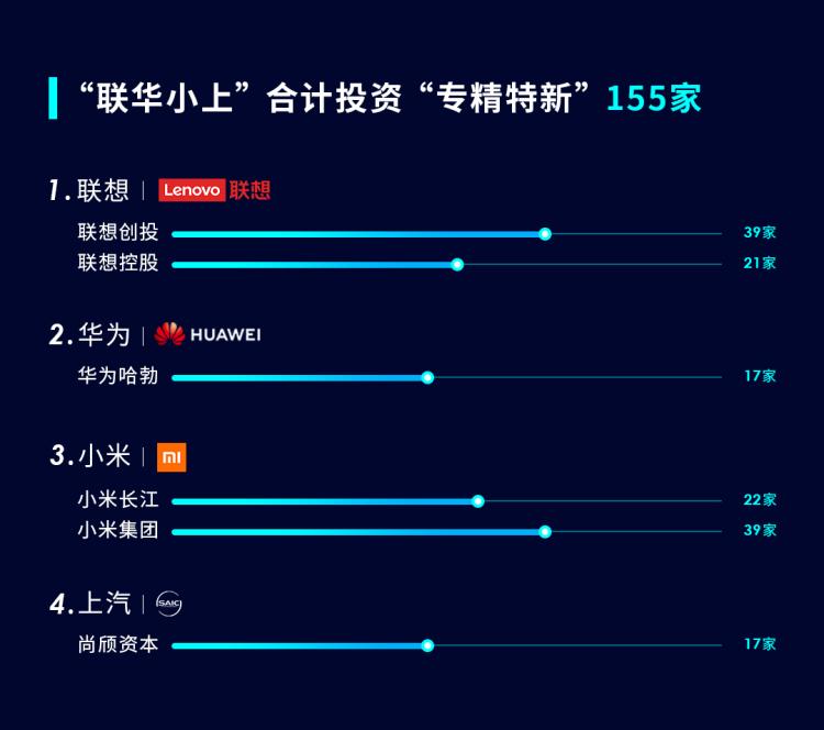 上述4家产业投资机构共投资了95家“专精特新”。如果再算上在榜的联想控股、小米集团,联想、华为、小米、上汽4家龙头企业及旗下投资机构,一共投资入股了155家“专精特新”。