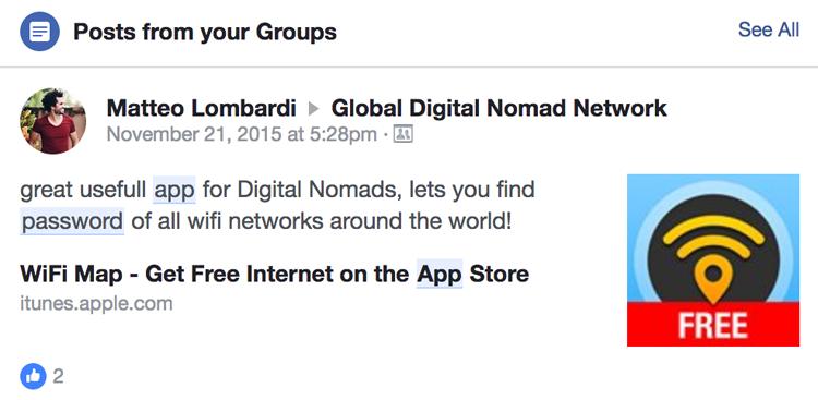 同时,加入相关的 Facebook 群组还可帮您向特定受众推广您的应用,如下图WiFi Map 案例所示。