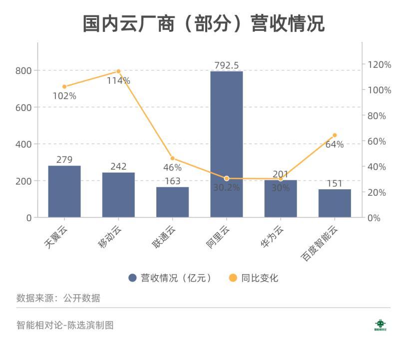 根据2021年财报数据,2021年中国电信天翼云营收279亿元,同比增长102%;移动云营收242亿元,同比增长114%;联通云稍弱,营收163亿元,同比增长46%。对比市场上的其他厂商来看,阿里云营收792.5亿元,同比增长30.2%;华为云营收201亿元,同比增长30%;百度智能云营收151亿元,同比增长64%。