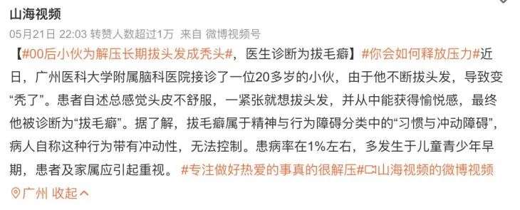 “拔毛癖”听说过么?前两天看到“00后小伙为解压长期拔头发成秃头”的热搜,有一位工作的小伙因为压力大导致情绪紧张,然后他开始不自觉地拔头发,从中获得一丝愉悦来缓解自己紧张、压抑的情绪。
