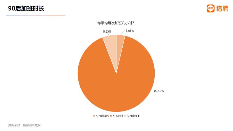 根据猎聘去年9月底发布的《当代年轻职场人现状洞察报告》调研数据显示:76.71%的90后职场人日常经常加班,其中加班时长在“1-3小时”的占比超9成。超长待机让职场人压力徒增。