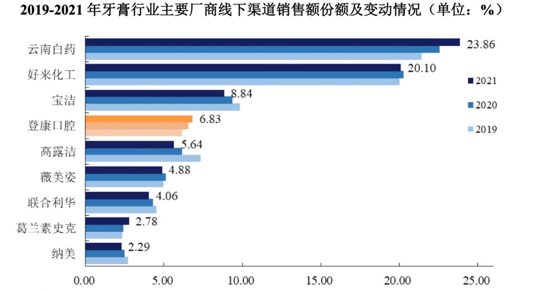 尽管冷酸灵在抗敏感牙膏这一细分领域拥有护城河,但在整个牙膏行业里,其并非处于足够头部位置。数据显示,2021年线下市场份额中,云南白药和好来(黑人)牙膏占有绝对主导地位,市场占有率分别达到23.86%和20.1%,登康口腔在宝洁之后,位居第四。不仅如此,后面还有高露洁、舒客穷追不舍,市场地位并不稳固。