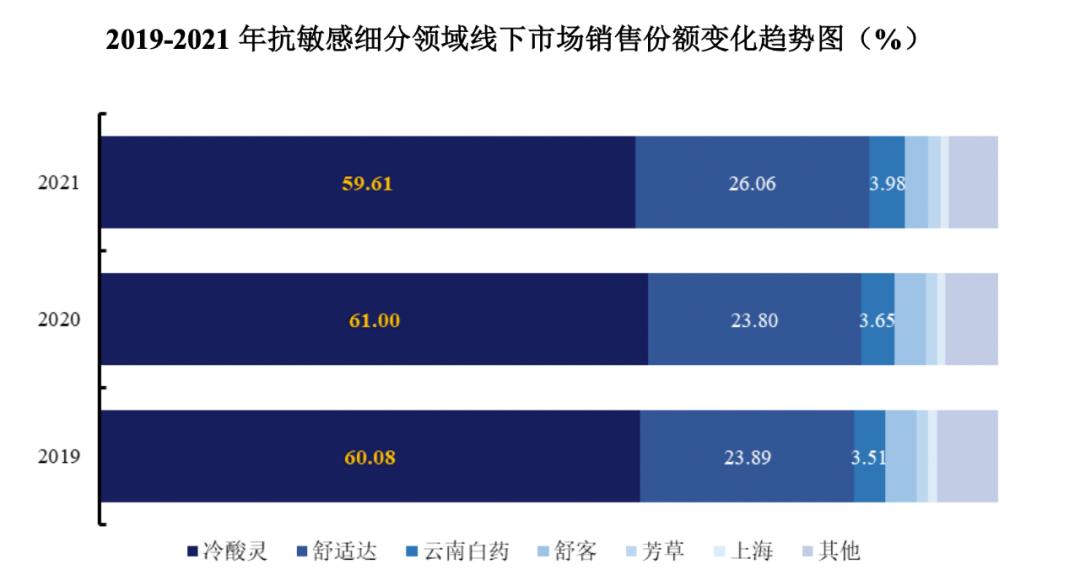 到目前为止,冷酸灵仍在抗敏感细分品类中排名第一。登康口腔援引尼尔森零售研究数据称,过去三年冷酸灵在此领域线下市场占比达到60%。