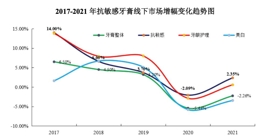 尼尔森零售研究数据显示,牙膏整体增速从2017年的6.5%下降至2021年的-2.26%,换句话说,牙膏产业已经在负增长。相比之下抗敏感类牙膏还是有一定的前景,2021年行业增速为2.35%。