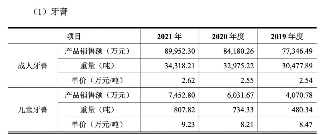 但孩子的钱还是比成人好赚得多。招股书显示,2021年成人牙膏的销售单价为2.62万元/吨,相当于每支100克牙膏仅售价2.62元,而儿童牙膏每100克售价9.23元,是成人的3.5倍。与此同时,2021年成人牙膏的毛利率为40.96%,儿童牙膏毛利达55%。登康口腔在招股书中称,目前儿童口腔护理产品是公司增速最快的部分,年复合增长率为35%。