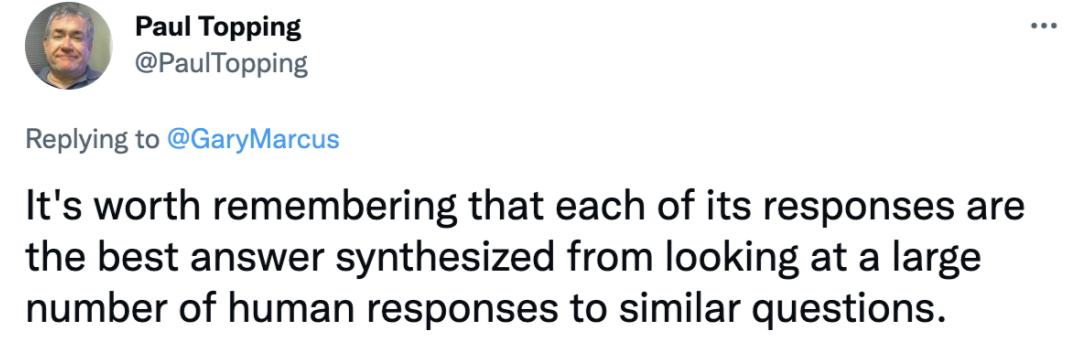 Paul Topping提醒我们,LaMDA所做的一切就是综合人类对类似问题的反应:值得记住的是,它的每个回答都是通过查看大量人类对类似问题的回答综合而成的最佳答案。