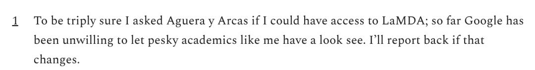 顺带提一下,马库斯称, 像自己这样讨厌的学者还没有得到谷歌的允许去访问LaMDA。