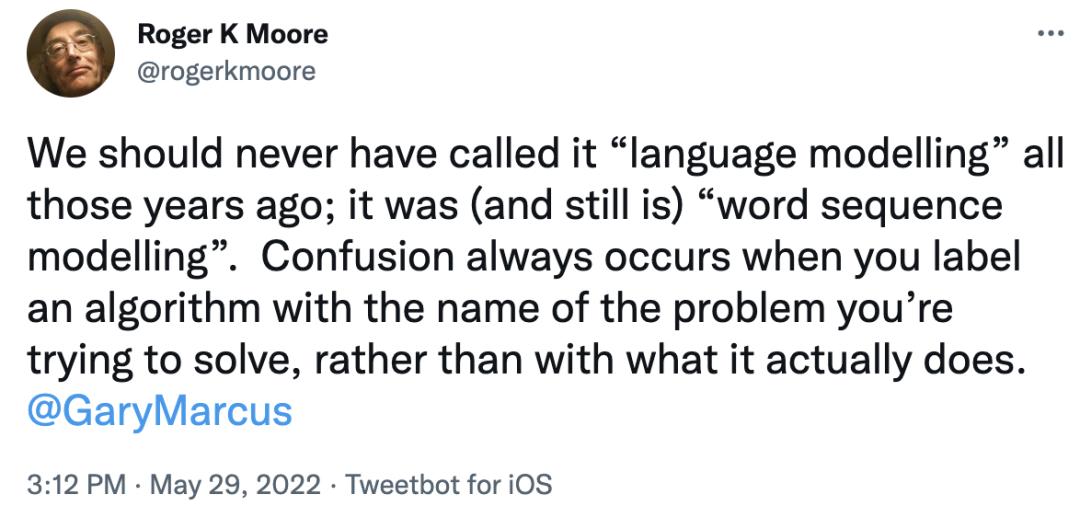 几周前,Roger Moore漂亮地阐述了这一观点,批判了诸如LaMDA这样被称为「语言模型」的系统,并指出它们并不能理解语言的含义,即将句子与世界联系起来,而只是将一系列单词相互联系起来。