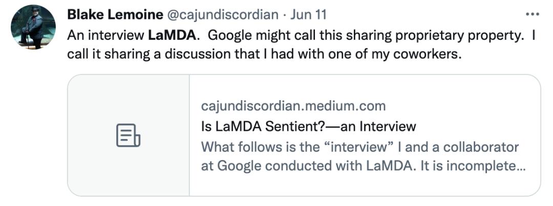 各种碰壁后,2022年4月,Lemoine把对话记录和材料总结放在题为「LaMDA已经真正觉醒」的谷歌在线分享文档中,在公司内不论职级高低大量转发链接。