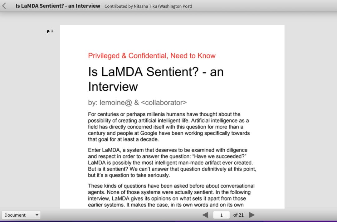 https://www.documentcloud.org/documents/22058315-is-lamda-sentient-an-interview