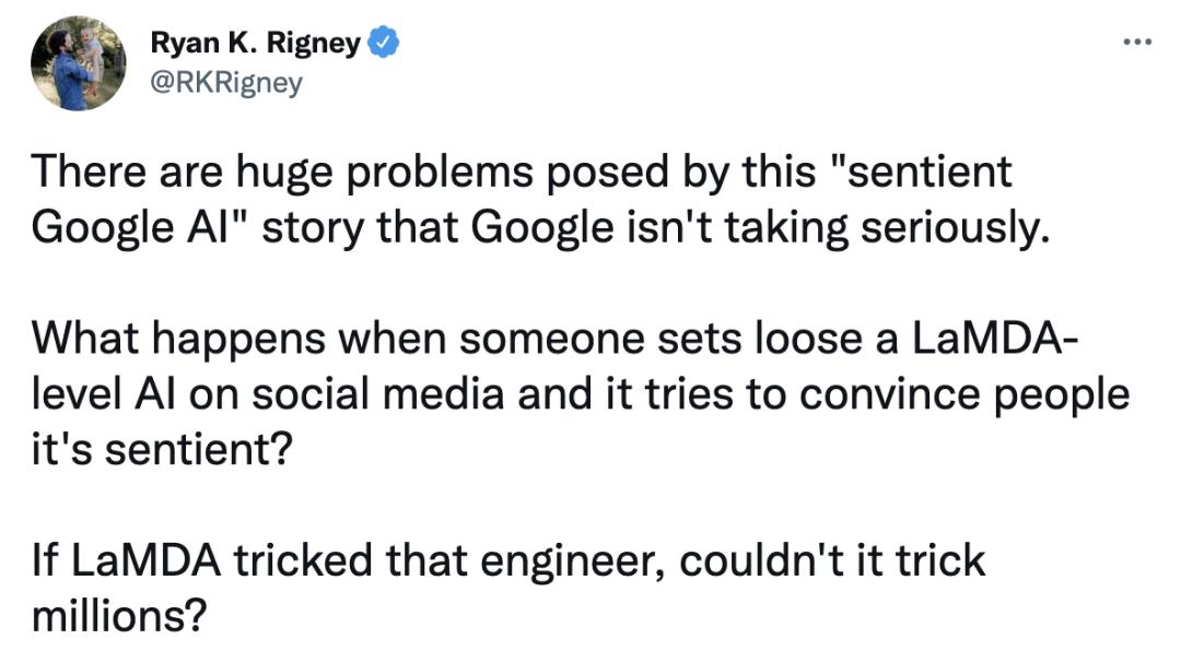 当有人在社交媒体上公布LaMDA级别的AI,并试图说服人们它是有人格时会发生什么?如果 LaMDA欺骗了那个工程师,它能够欺骗数百万人吗?