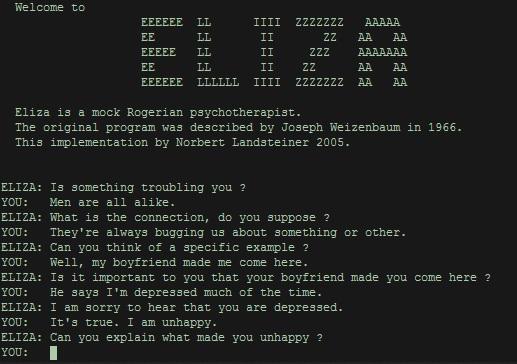 1965年,一个假装是心理治疗师的软件ELIZA赢得了图灵测试。还有一个定位成13岁男孩的聊天机器人尤金·古斯特曼(Eugene Goostman)同样如此。