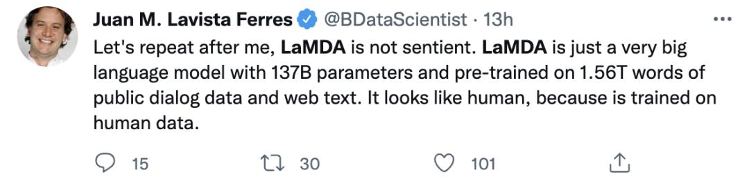 再说一遍,LaMDA不具有人格。它只是一个非常大的语言模型,有137B个参数,并在1.56T的公共对话数据和网络文本上进行了预训练。说它看起来像人类,是因为在人类数据上进行训练的。