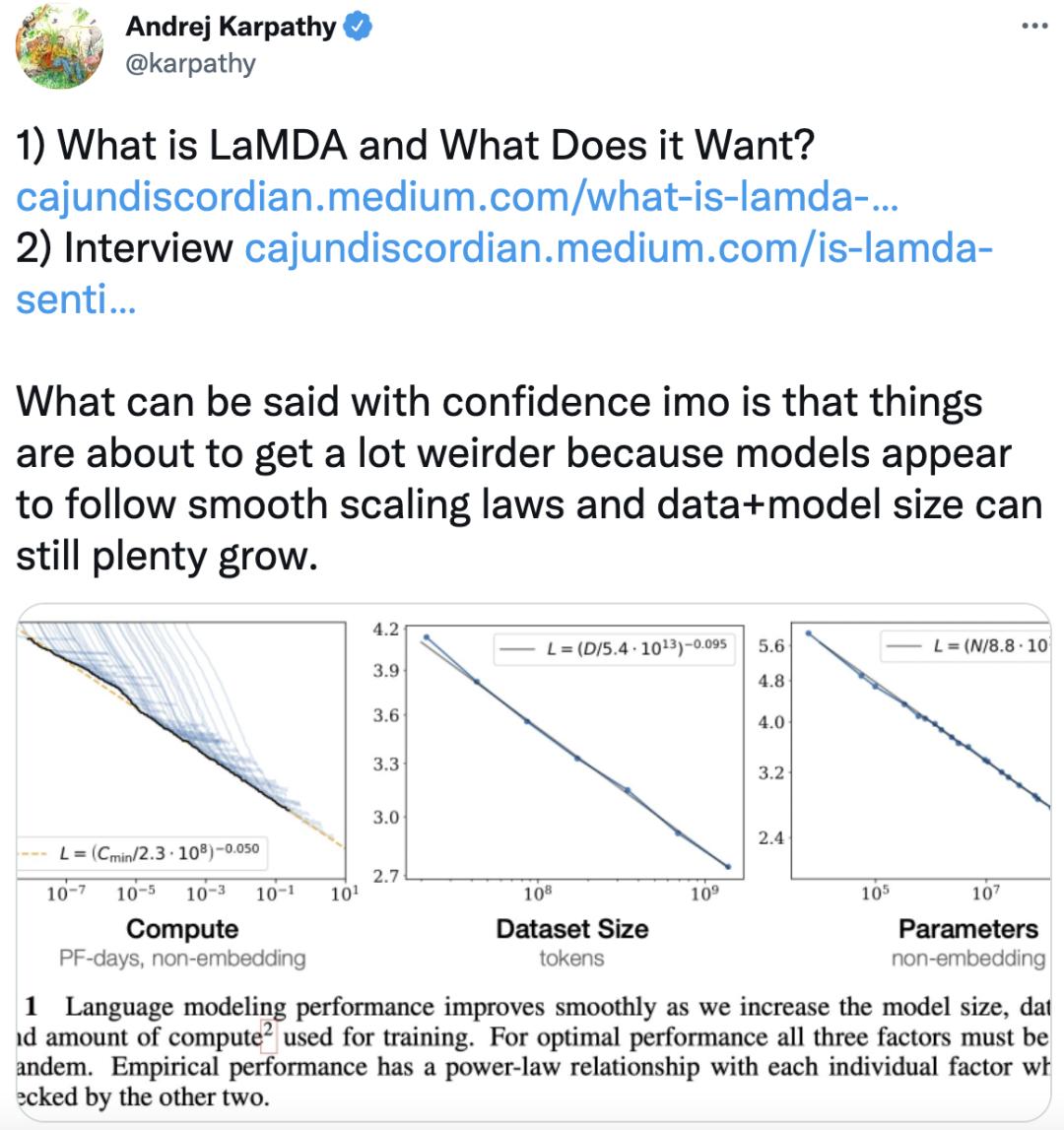 特斯拉的AI主管看完Blake Lemoine两篇文章后表示,「我可以自信地说,事情将变得更加诡异。因为模型似乎遵循平滑缩放规律,并且数据+模型的大小仍然可以大量增长。」