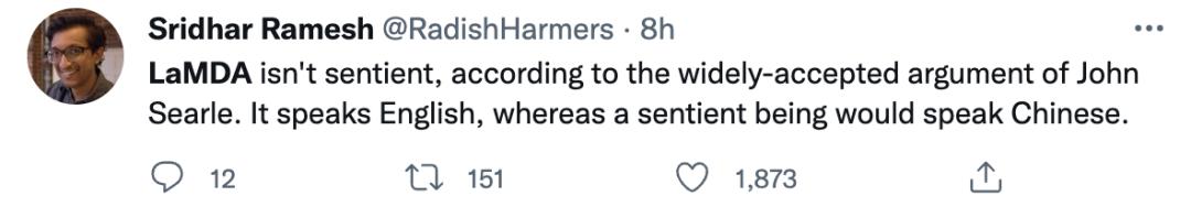 依据John Searle被广泛接受的观点,LaMDA不具有人格。它会讲英语,若说具有人格那得会说中文。