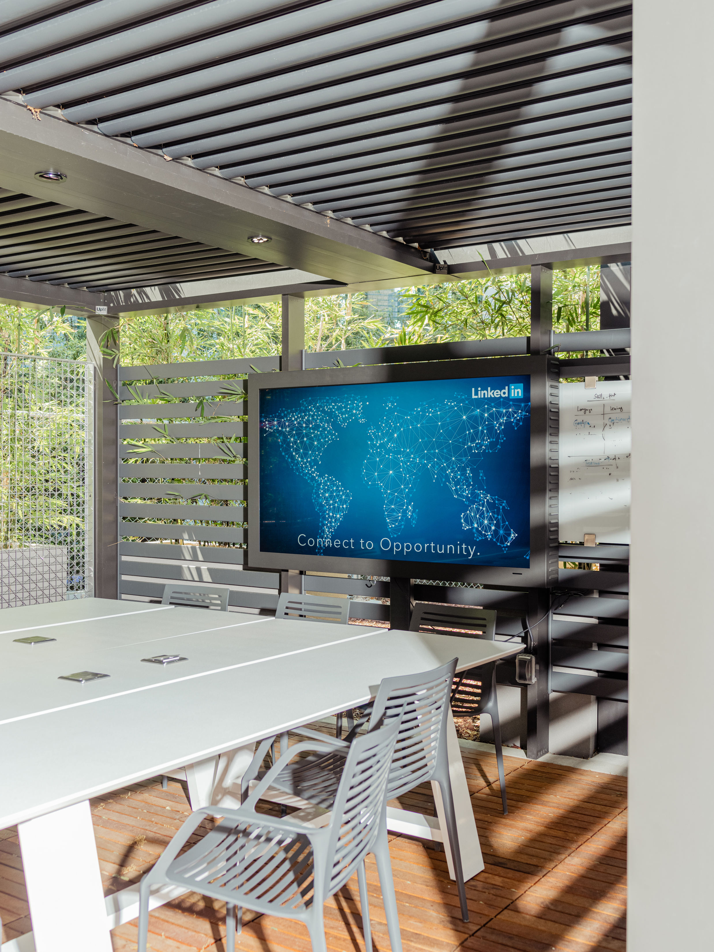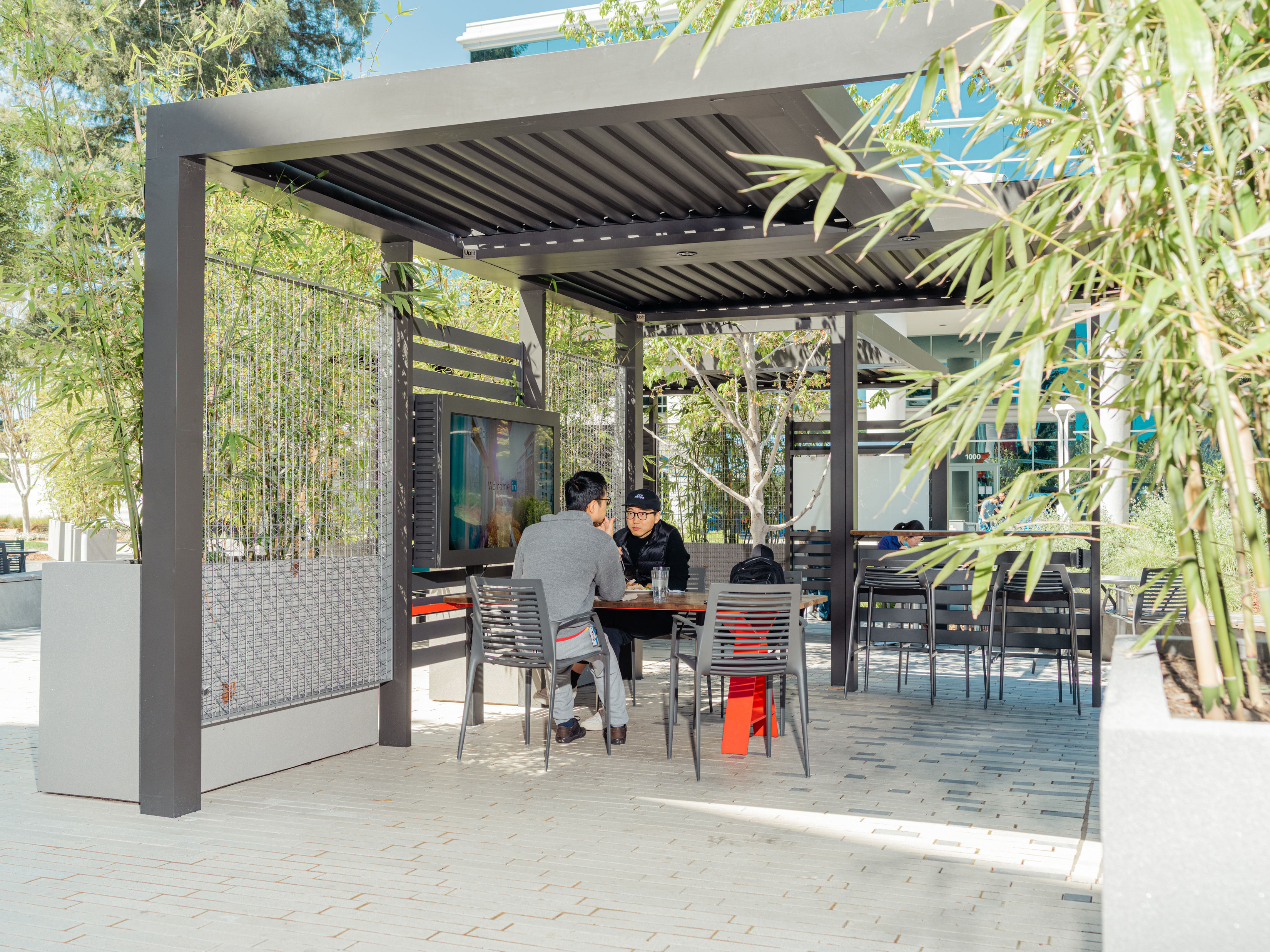 布里茨说,考虑到加州温和的气候,领英一直在考虑建立户外工作空间。在疫情期间,自然通风的好处凸显了出来,于是该公司把想法付诸实践,配备了一个可供会议讨论的广场空间。该空间包括由钢和木材制成的顶部结构,带有百叶窗,以减少阳光对笔记本电脑和显示器的造成的反光,还有各种尺寸的白板和桌子,都有内置电源插座。