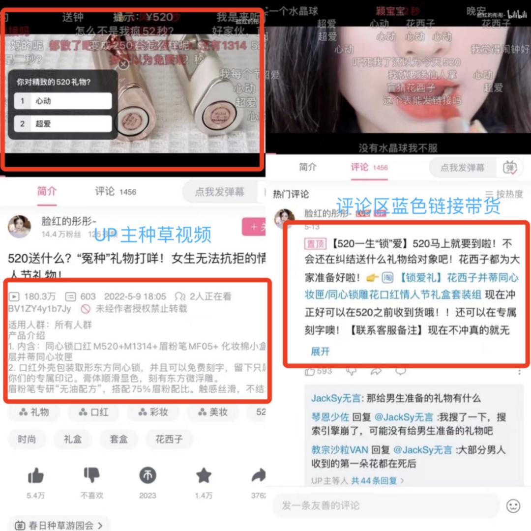 今年520节点,花西子单价520元的国货礼盒在B站卖爆,成交接近300万。B站UP主脸红的彤彤发布的《520送什么?“冤种”礼物打咩!女生无法抗拒的情人节礼物!》上线第一天冲上主站热门榜,5天破百万播放,ROI高达2.67,还在站内引发一场关于性别议题的讨论。