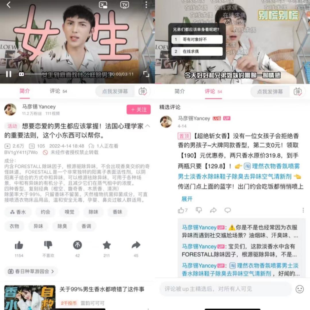 在B站,男性美妆类UP主在进行视频创作时,通常会把卖点情景化、可视化,比如,香水的特点是难用视频形式展现,UP主马彦锡就把香水产品放在了男女谈恋爱的场景,利用气味来吸引对方,增加用户代入感。