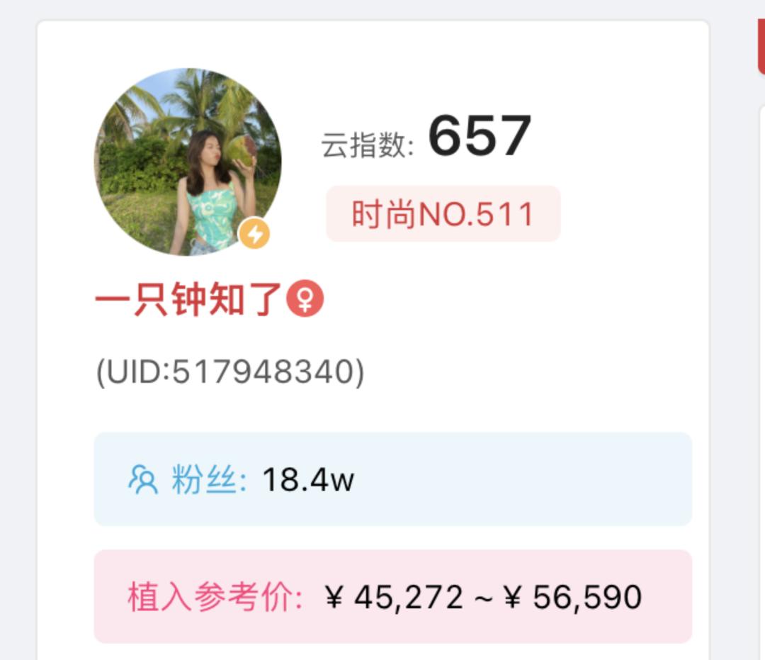 据火烧云数据显示,一只钟知了现在的定制报价四五万左右,相较于头部UP主的高报价高回报,投放价值更具“性价比”。