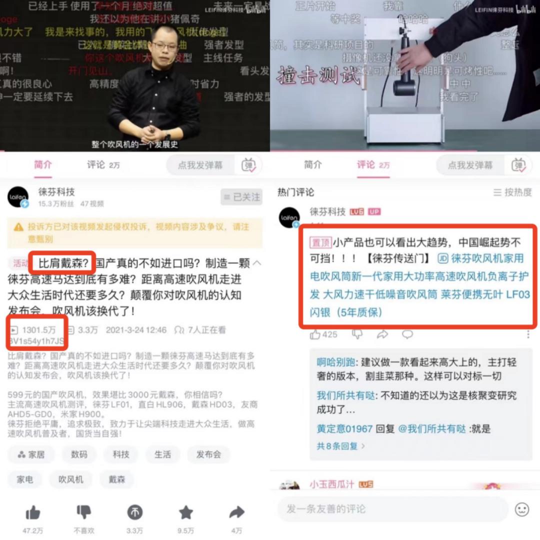 去年3月,徕芬科技一条《比肩戴森?国产真的不如进口吗?》视频爆火,播放量达1297万,通过直截了当的产品测评以及和戴森的对比,以足够的诚意向网友陈述了新款吹风机的产品卖点,配合评论区带货链接及起飞加热,对于他们而言,就可以收获最直接的私域流量。