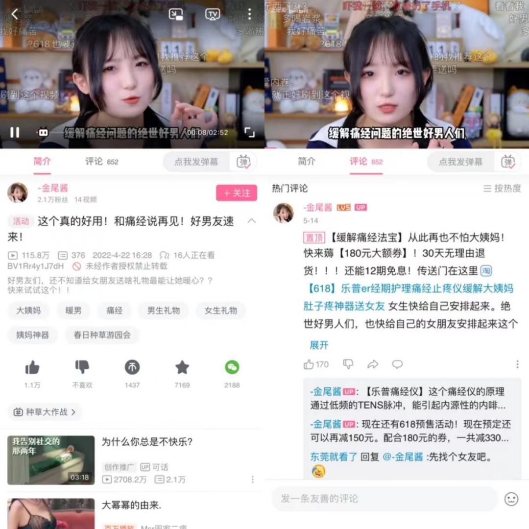 实际上,花西子的案例不是孤例。粉丝只有1.9万的UP主金尾酱,今年4月份发布了一条《跟痛经说再见!好男友速来》的视频,截至目前已超百万播放,带货产品是一款乐普的经期护理仪,客单价近千元,ROI却一直能稳固在2左右,520节日前后的ROI可以达到3-4。