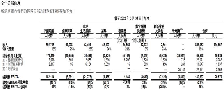 其中,国际商业板块亏损106.55亿人民币,本地生活服务板块亏损304.85亿人民币,菜鸟部分亏损39.2亿人民币,云计算业务亏损51.67亿人民币,数字媒体及娱乐业务亏损70.19亿人民币,创新业务及其他部分亏损94.24亿人民币,未分摊部分亏损359.11亿人民币。