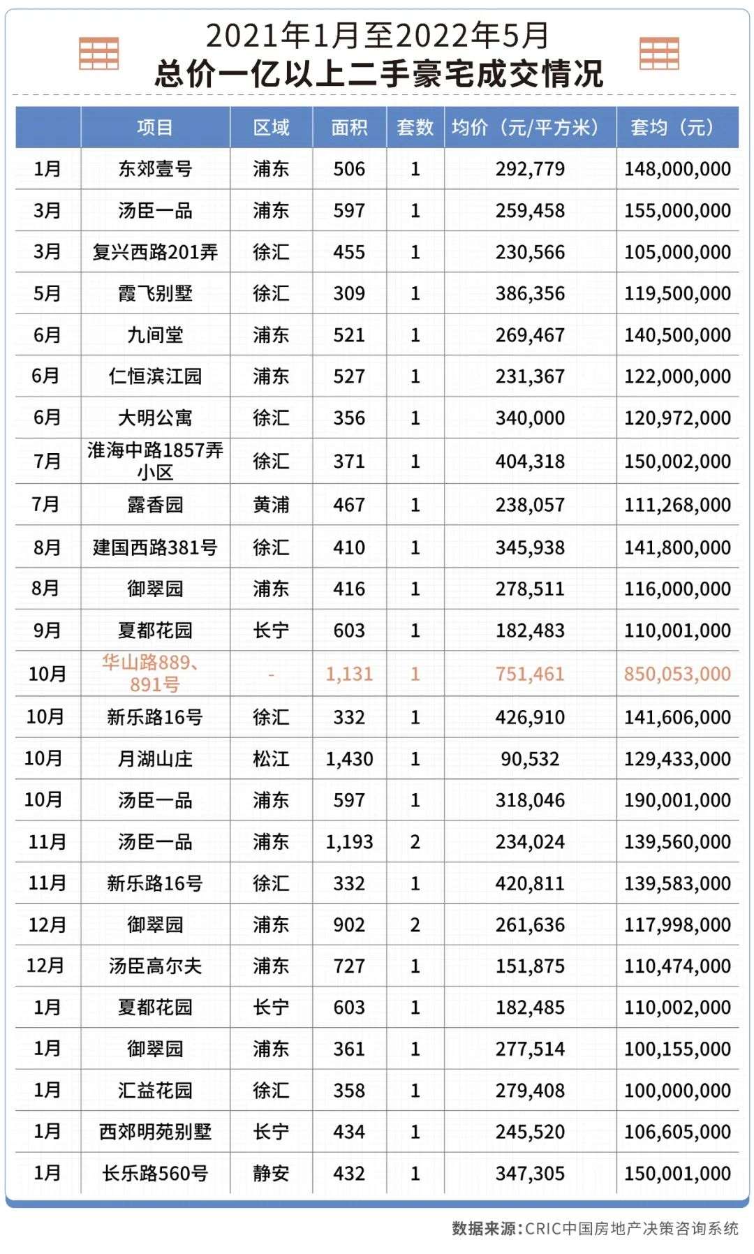 可供参考对比的CRIC数据是,2021年以来,上海总价1亿以上的豪宅(含新房和二手房)一共只成交了45套。
