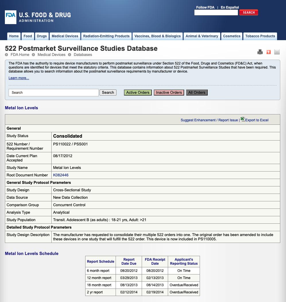 图源:FDA FDA 要求 MoM 髋关节置换后进行金属离子水平监测