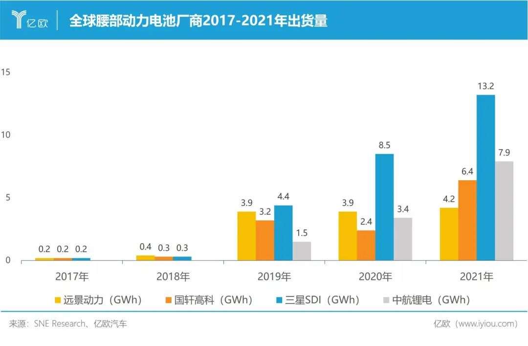 快速成长的企业中,中国动力电池企业占据大半江山,以远景动力、国轩高科、中航锂电等为代表的厂商,在五年内实现了10倍以上涨幅。而三星SDI则在全球腰部企业中一路领跑,2021年出货量突破10GWh。