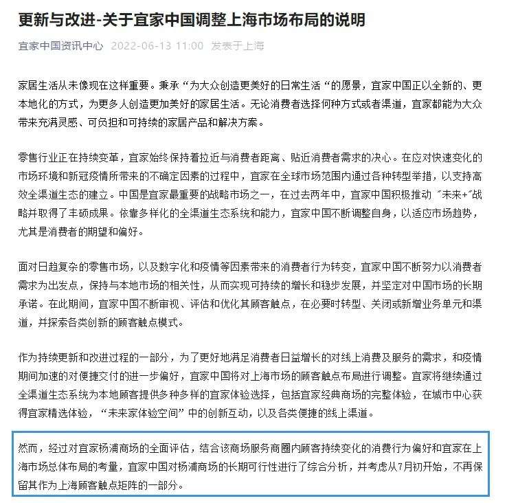 简而言之,根据宜家在上海已有的市场总体布局、变化的消费行为偏好是公司认为杨浦商场缺乏长期经营可行性的主要原因。