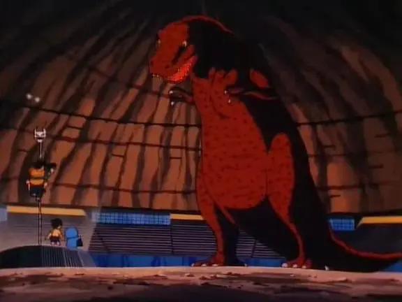 在1980年版《大雄的恐龙》中,剧情安排大家穿越回到6500万年之前的北美大陆,为的就是能利用北美的考古发现,让霸王龙等知名恐龙合理登场。片中霸王龙贡献了最多的打戏,其形象则保持着早期的尾巴拖地造型以及两根手指。