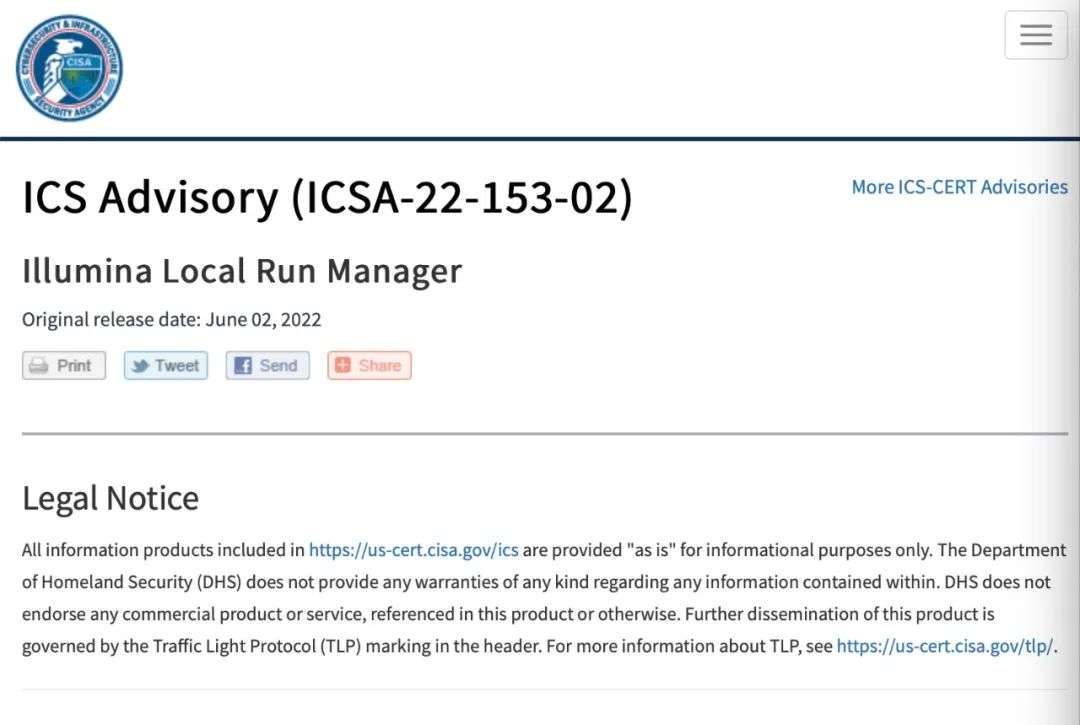 据FDA声明称:“illumina网络安全漏洞可能会给患者结果和客户网络带来风险,影响本地运行管理器 (LRM) 软件。未经授权的用户可以通过以下方式利用该漏洞:远程控制仪器;操作系统以更改仪器或客户网络上的设置、配置、软件或数据;或者影响用于临床诊断的仪器中的患者测试结果,包括导致仪器不提供结果或不正确的结果、更改的结果或潜在的数据泄露。”