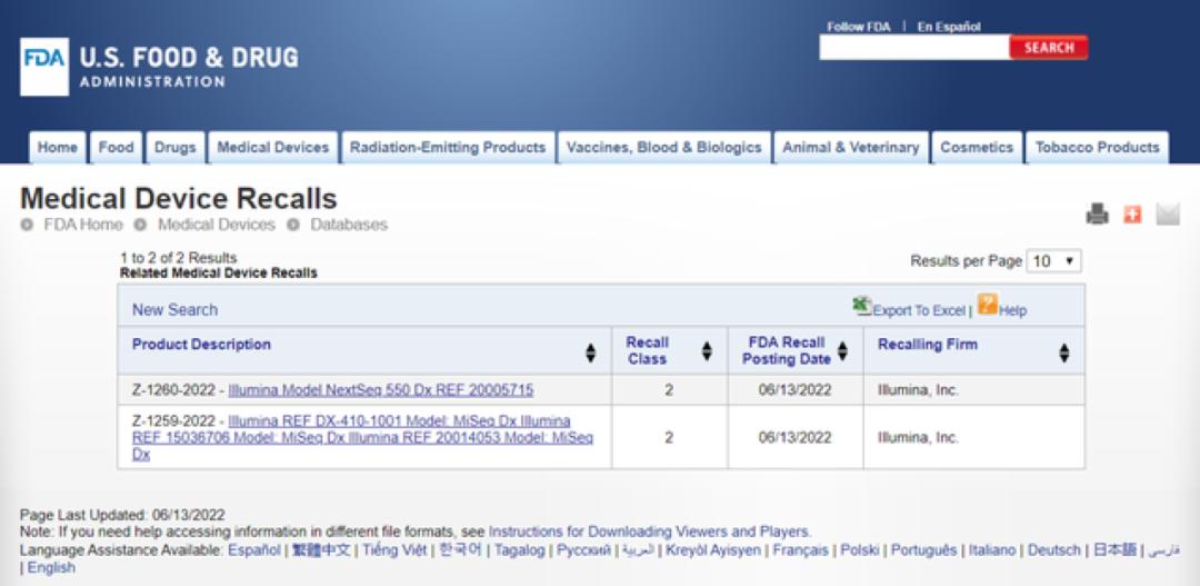 6月2日,FDA和CISA曝光illumina公司之后,经过十多天的调查,6月13日PDA正式发布医疗器械召回通知,涉及NextSeq 550Dx、MiSeq Dx、NextSeq 500、NextSeq 550、MiSeq、iSeq 100 和使用 Local Run Manager (LRM) 软件版本 1.3 至 3.1 的 MiniSeq,总数量为799+1014台。