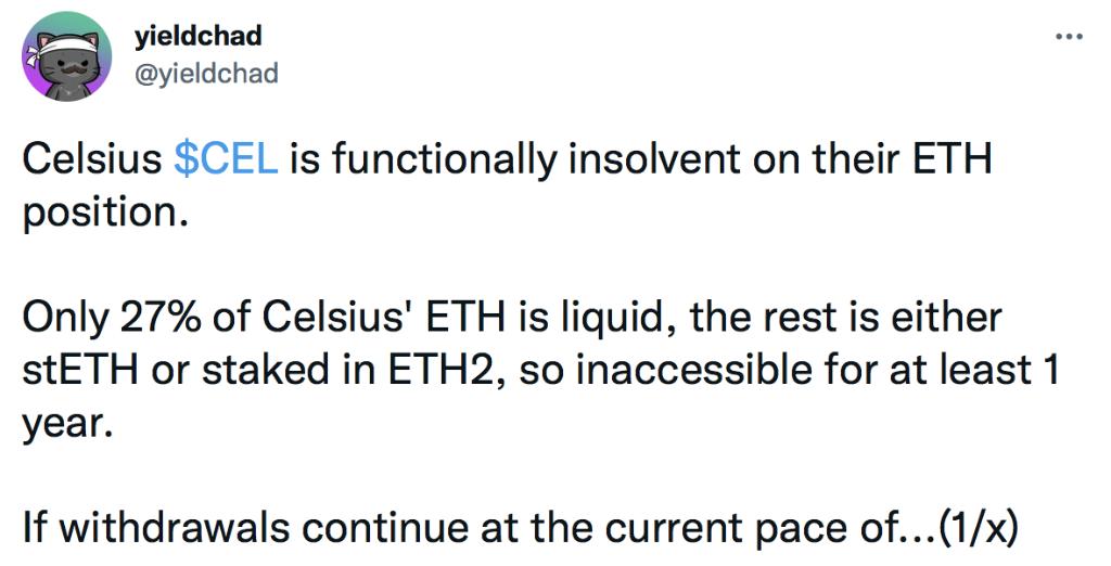 而由于Celsius持有大量stETH,其流动性开始引发市场关注。据Twitter用户yieldchad的分析,Celsius可能已经资不抵债。