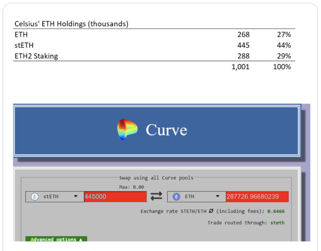 Celsius共计持有100万枚ETH,但其中只有26.8万枚(近27%)是有充足流动性的。在另外的73%中,有44.5万枚是“Lido Stake Ethereum”所提供的stETH,按照目前在Curve(一个基于以太坊的去中心化流动性提供平台)的汇率只能兑换出28.7万枚ETH,而剩下的28.8万枚质押在了以太坊2.0合约中,至少在一年时间内无法取出。