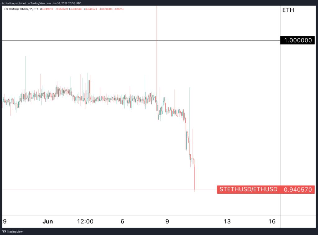 然而随着美联储激进“收水”对着全球风险资产疯狂扫射,在6月10日左右,stETH与ETH的价格开始出现脱锚,其价格跌至0.95ETH左右。