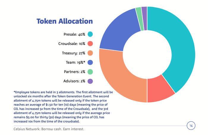 这里引出了CEL代币。在Celsius所发布白皮书中提及,Celsius以每个代币0.20美元的价格对CEL代币进行了预售(占CEL代币总数的40%),随后以每代币0.30美元的价格进行了众筹(占CEL代币总数的10%)。
