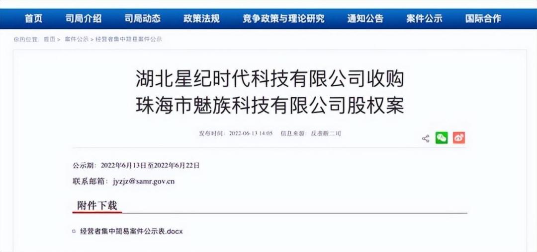 6月13日,根据国家市场监督管理总局发布了湖北星纪时代科技有限公司收购珠海市魅族科技有限公司股权案案件公示。