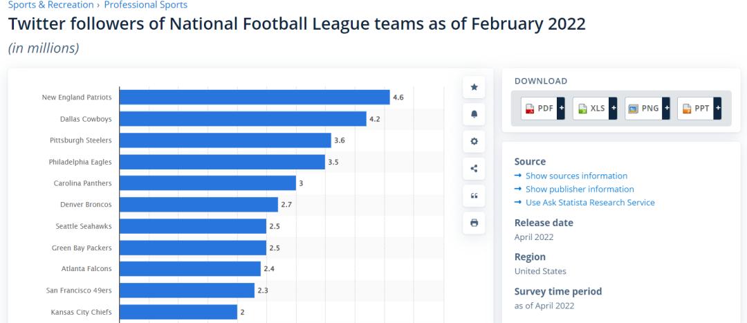 野马的推特账号粉丝达到270万人,目前排在联盟第六 图片来源:Statista