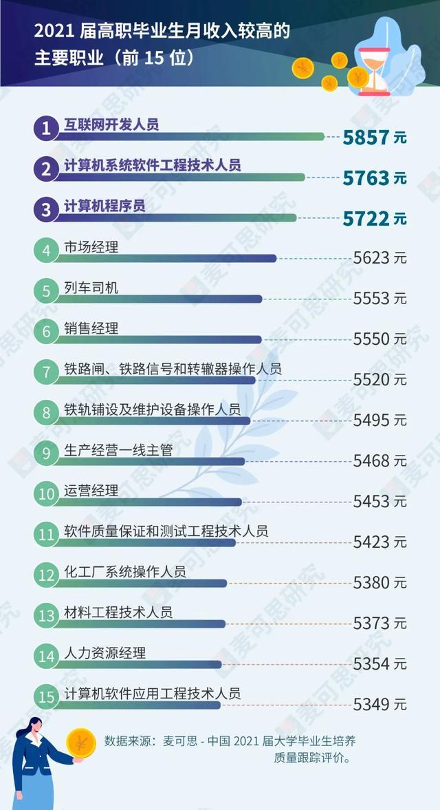高职毕业生选择的TOP 3高薪职业有:互联网开发人员(5857元)、计算机系统软件工程技术人员(5763元)、计算机程序员(5722元)。
