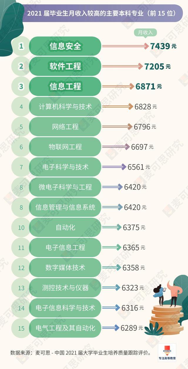 本科专业TOP 3:信息安全(7439元)、软件工程(7205元)、信息工程(6871元)。值得一提的是,前十五名中,有6个计算机专业和5个电子信息类专业。