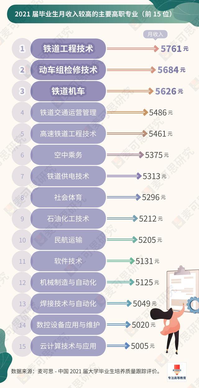 高职专业TOP 3:铁道工程技术(5761元)、动车组检修技术(5684元)、铁道机车(5626元)。