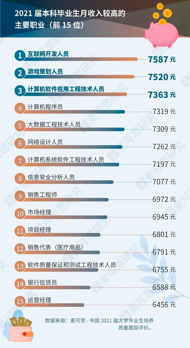 其中,本科毕业生选择的TOP 3高薪职业有:互联网开发人员(7587元)、游戏策划人员(7520元)、计算机软件应用工程技术人员(7363元)。