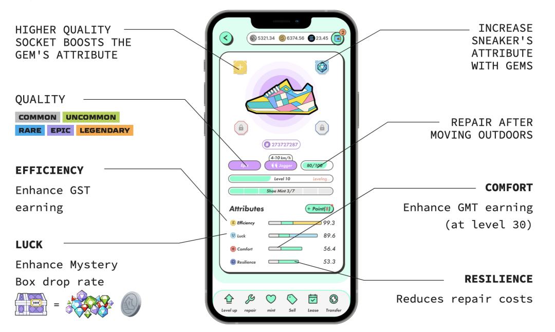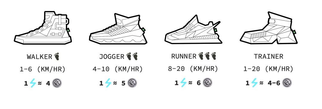 鞋子(Sneaker)包括 4 种类型:Walker(步行鞋)、Jogger(慢跑鞋)、Runner(跑步鞋)和 Trainer(训练鞋),每种类型对应不同的配速和基础回报。鞋子的品质包括:普通、罕见、稀有、史诗、传说,玩家会用不同的颜色去指代它们:灰鞋代表普通,绿鞋代表罕见、蓝鞋代表稀有……